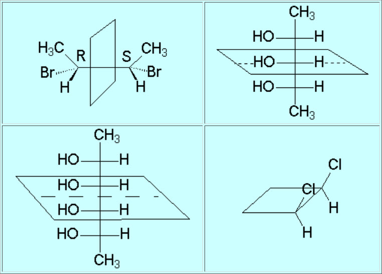 Estos son ejemplos de formas MESO. Las formas meso parecen quirales porque tienen varios estereocentros. Pero la simetría global de la molécula cancela la quiralidad. La imagen especular de una forma MESO es siempre superponible.